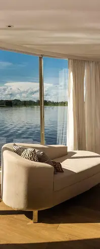 Enjoy stunning Amazon views from the extra-large windows in all 10 suites, including 4 interconnected family options. Our 4 forward-facing Master Suites provide the most spectacular vistas with 180° panoramic windows, along with a king-size bed with premium linens, organic amenities, and individual reading lights for ultimate calm and enjoyment.